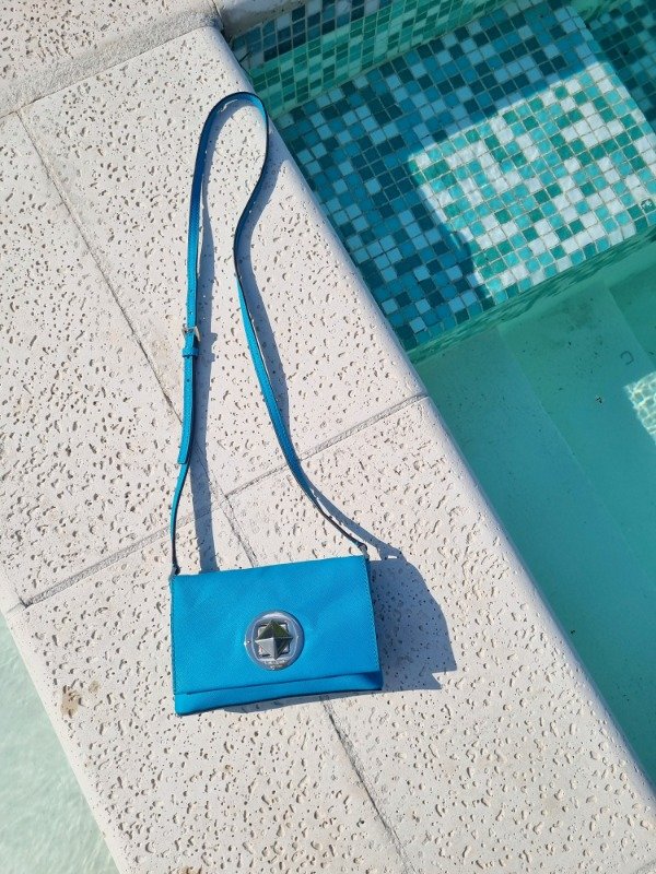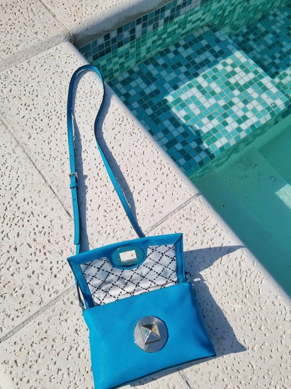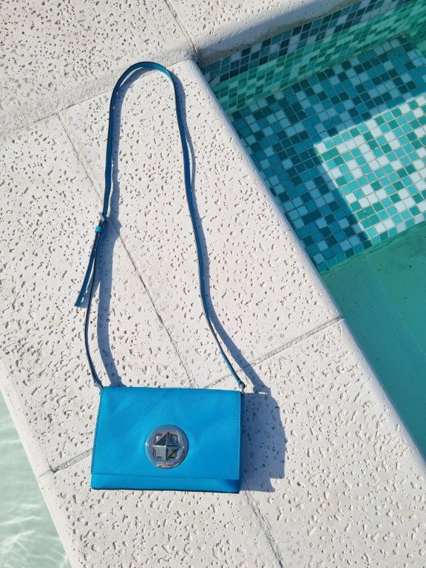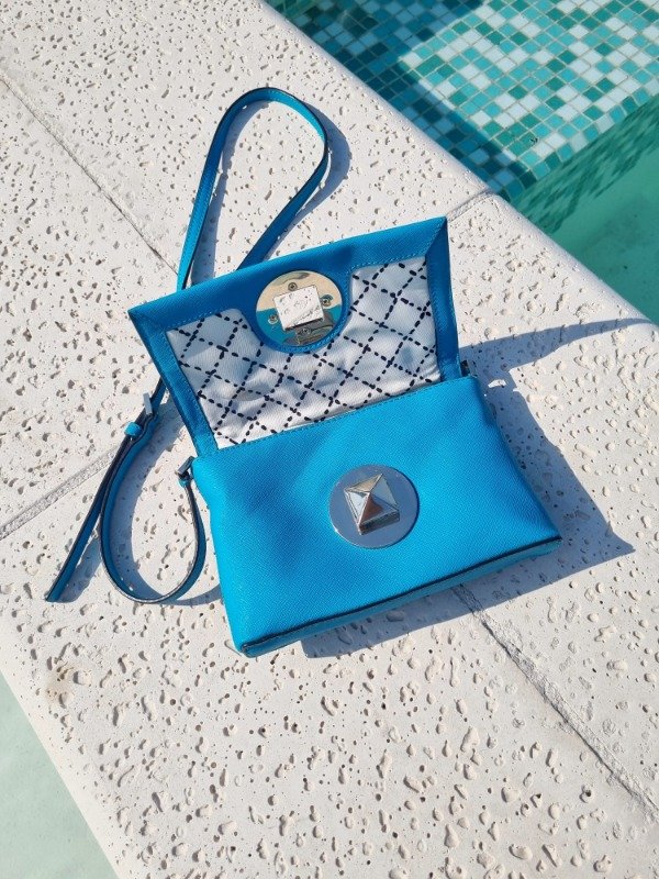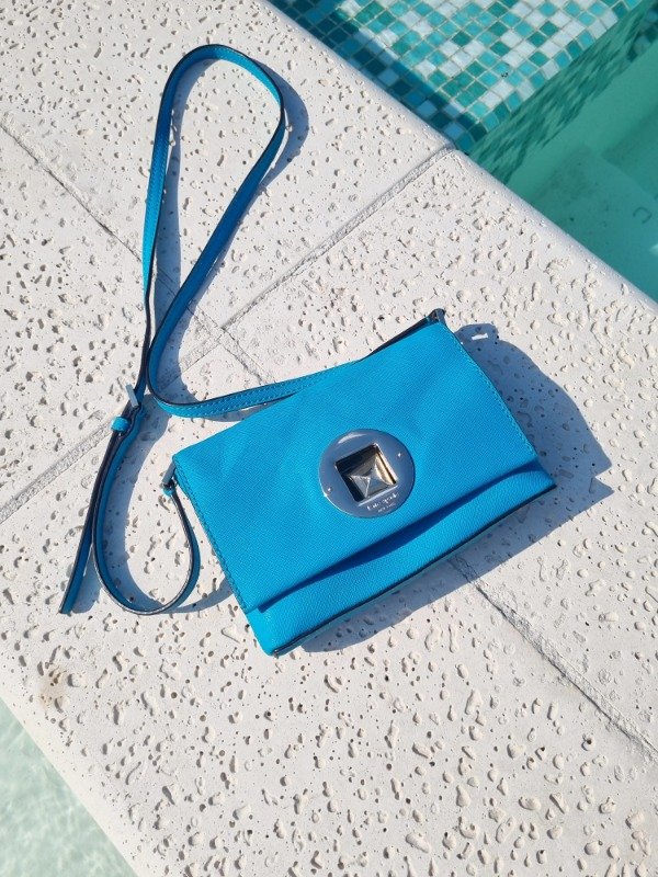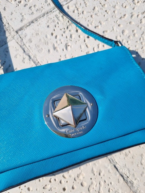 Cartera Kate Spade New York de saffiano color turquesa con interior típico de la marca en canvas. Traba con una pirámide cromada que se gira. Correa regulable.