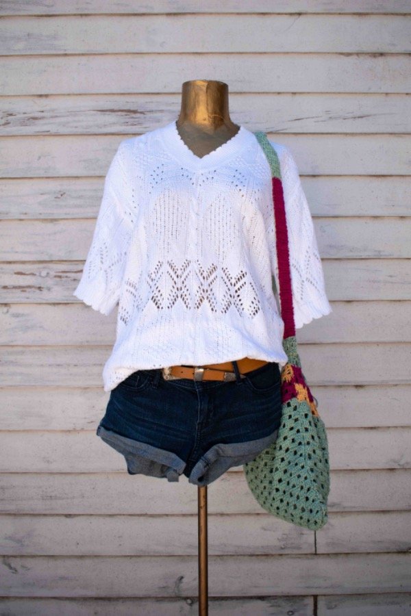 Morral tejido a crochet. Hermoso, forrado. Sin detalles. Mide 35 x 40 cm de ancho, las manijas miden 43 cm de altura.
