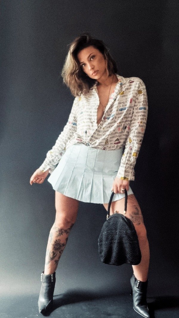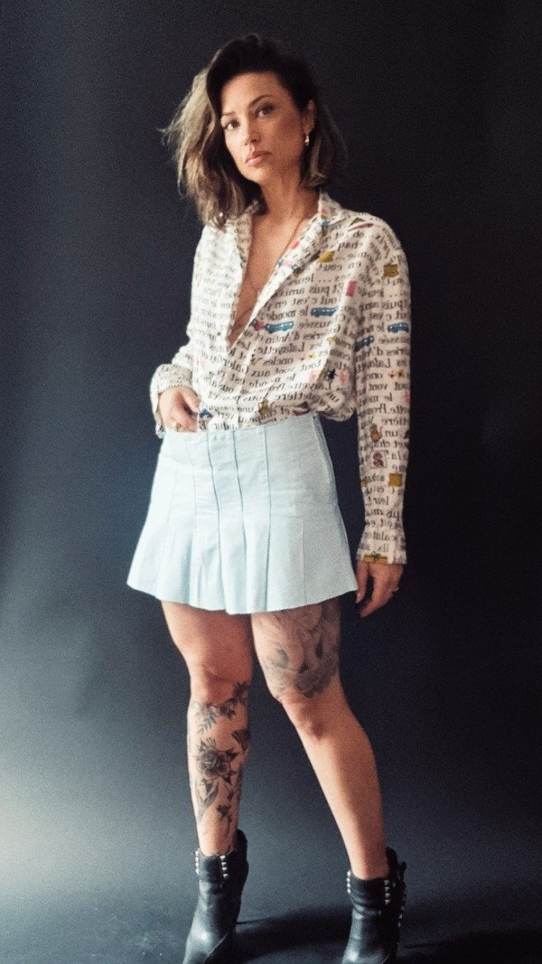 Mini falda Las Pepas confeccionada en cuero vacuno color celeste hielo, forrería a tono.