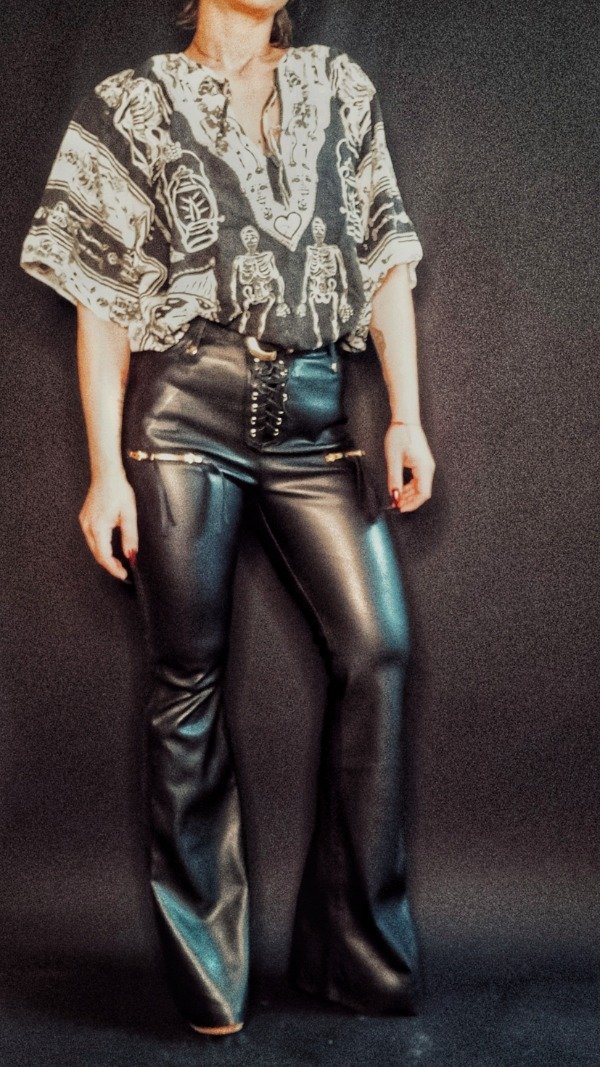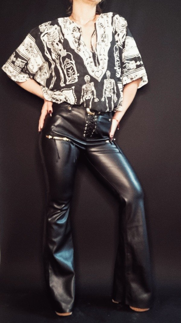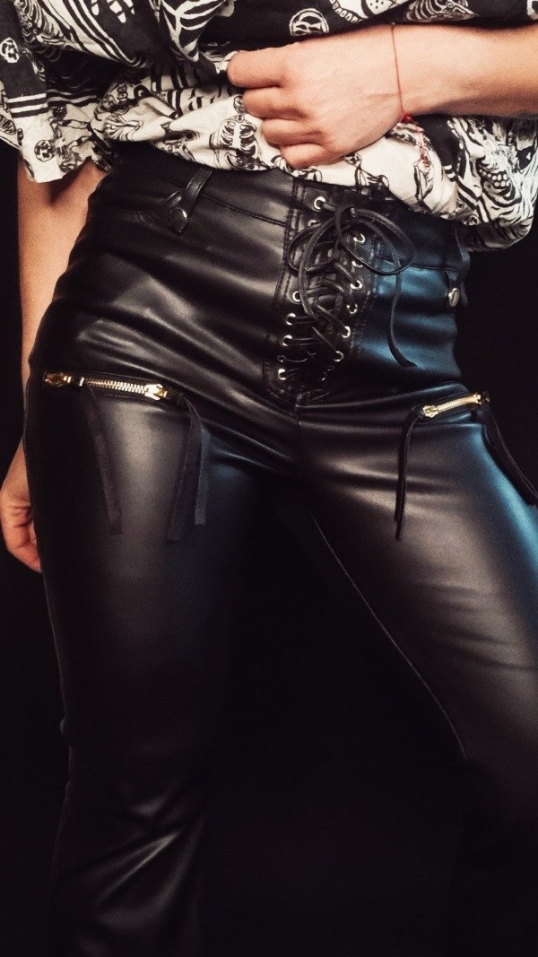 Pantalón oxford efecto piel tiro alto. Acceso frontal con cordones.