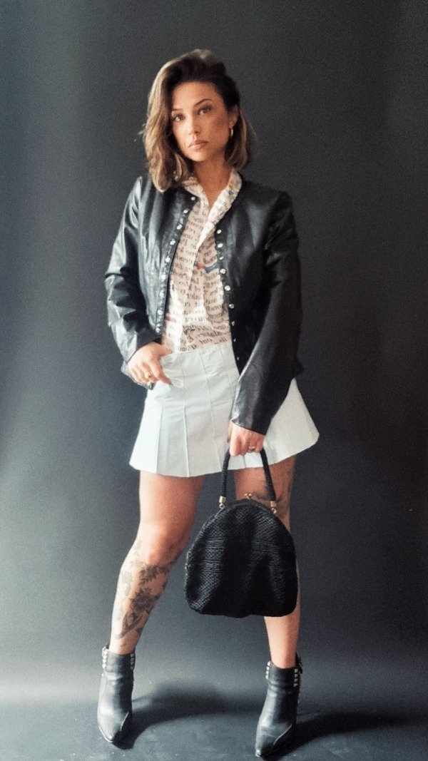 Campera cuello redondo simil cuero color negro, levemente entallada. Forrería a tono. Cierra con botones a presión.