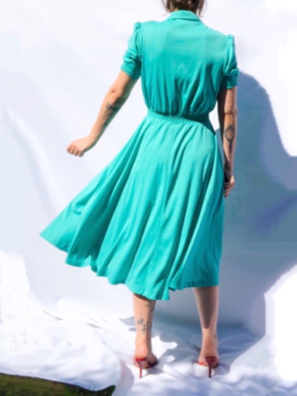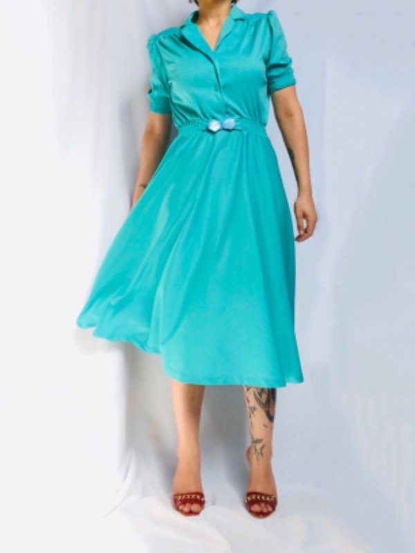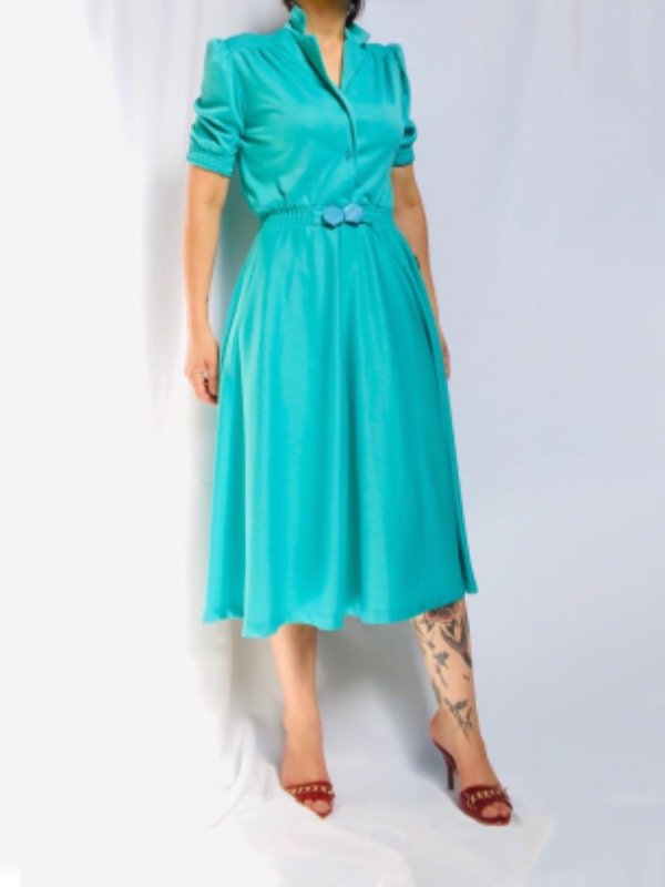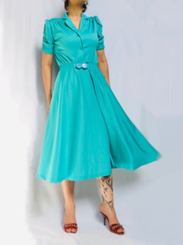 Vestido cuello polo manga corta, ceñido a la cintura con hebilla al tono, largo midi. Es de poliéster, un poco caluroso, ideal para media estación.