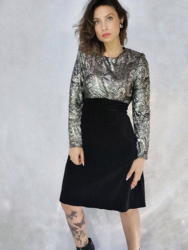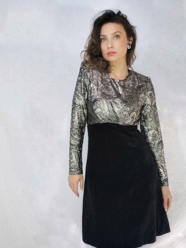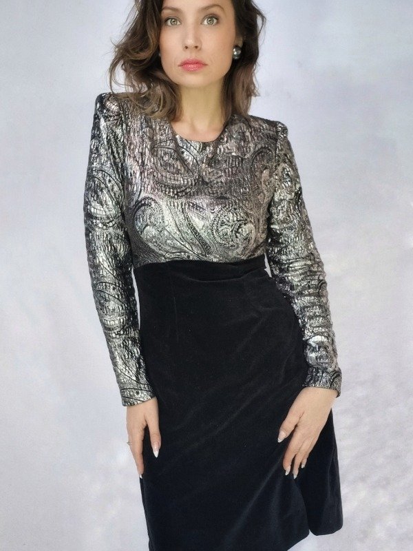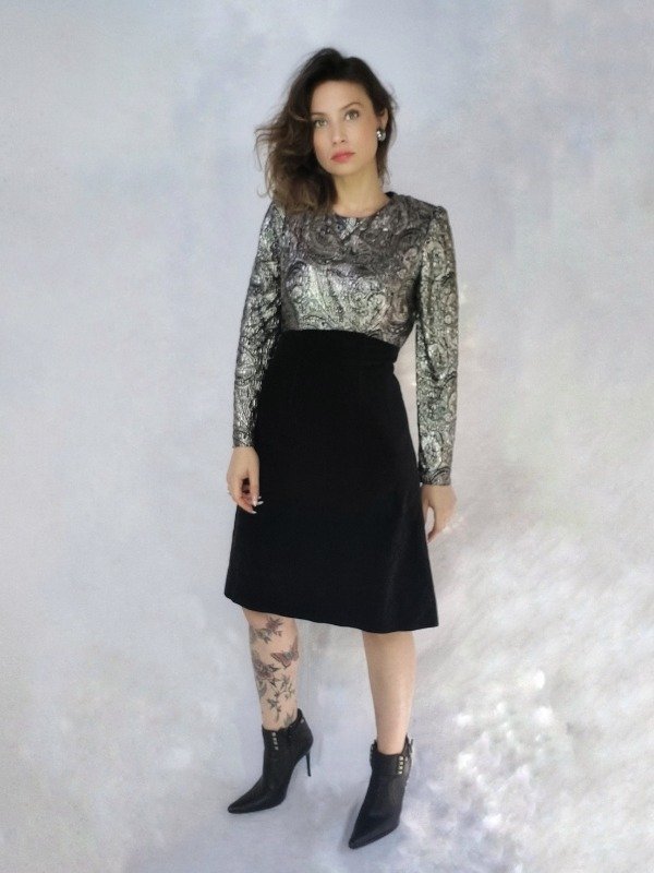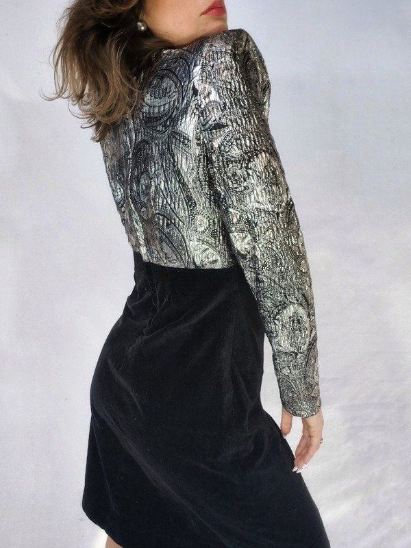 Vestido vintage a la rodilla confeccionado en lame plata y terciopelo negro. Marca Another Time. Tiene hombreras, estas son fácilmente desechables ya que están cosidas con apenas dos puntadas. Made in USA.