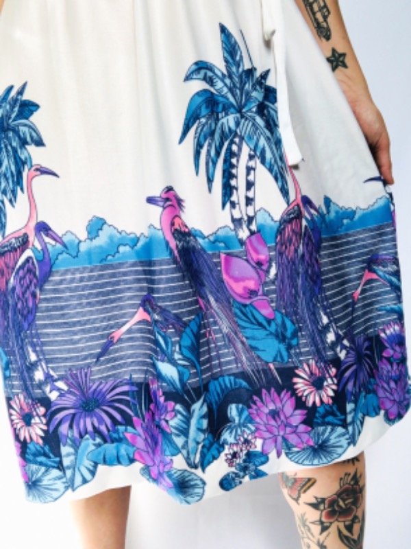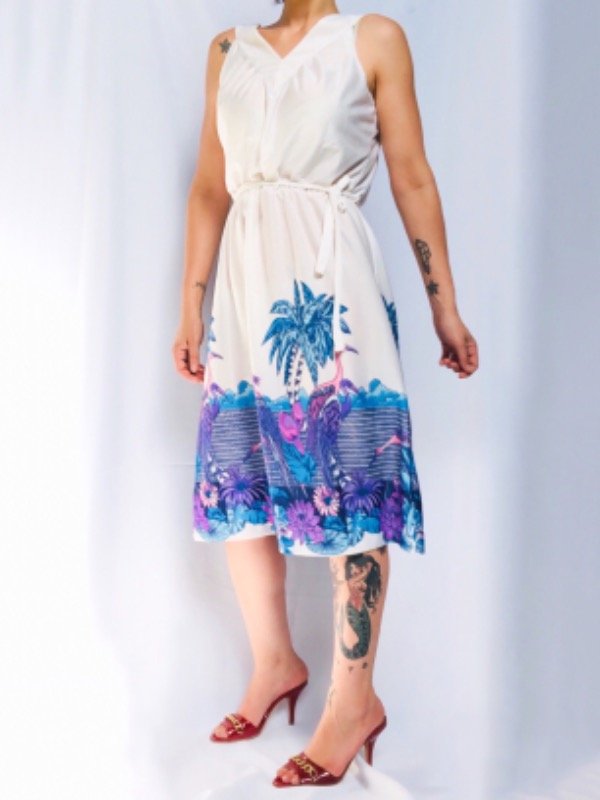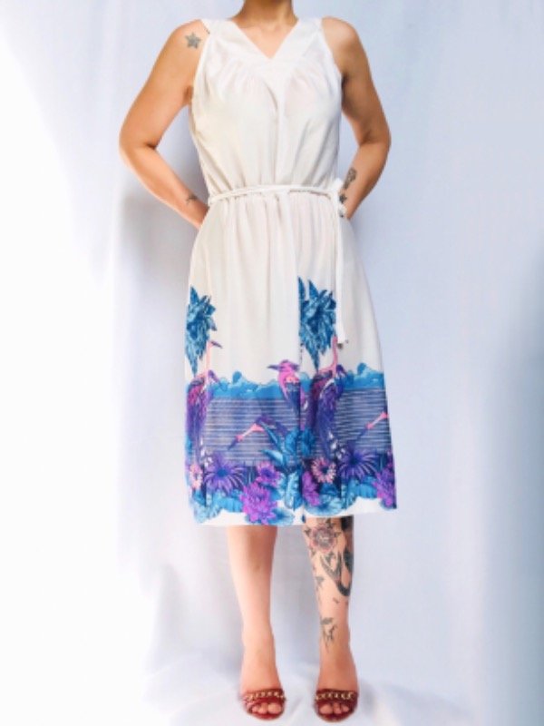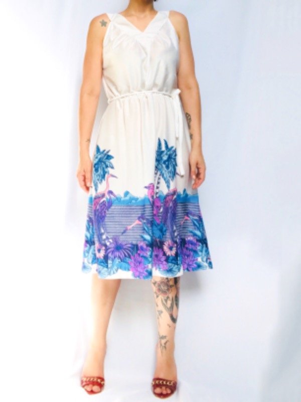 Vestido vintage sin mangas en largo midi con diseño de aves y plantas en la parte baja, elástico en la cintura y lazo en el mismo tejido.