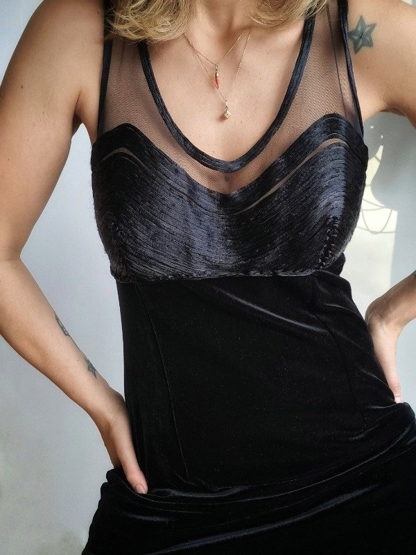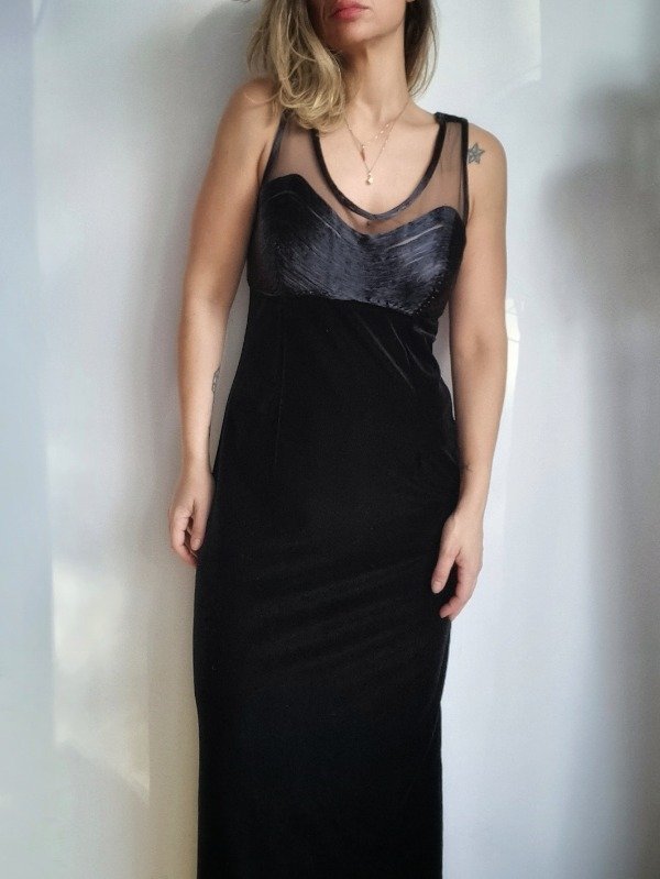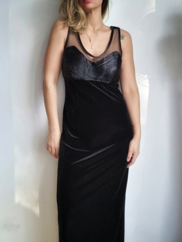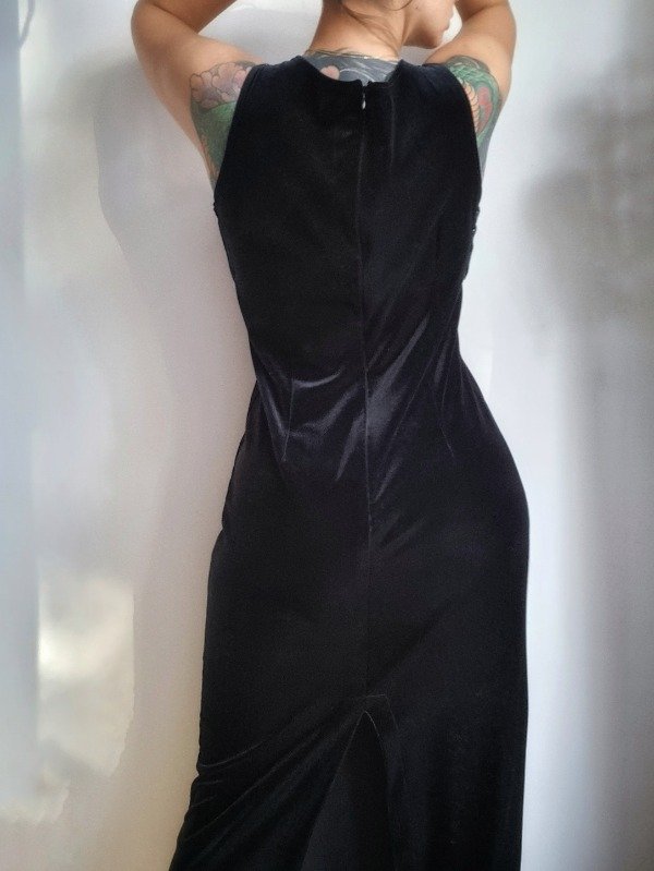 Vestido vintage 90s, largo, confeccionado en terciopelo elastizado color negro. Tajo trasero de 60 cm. Impeca.