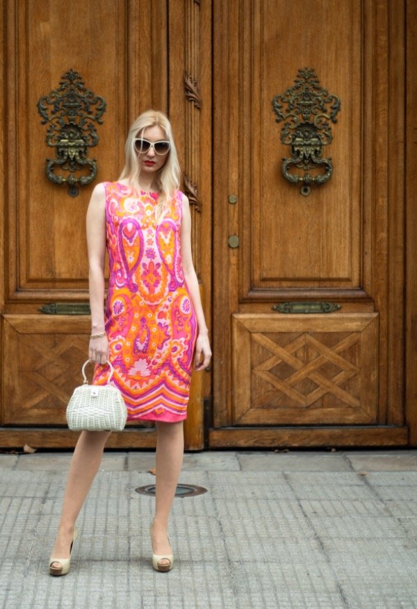 Vestido vintage 60s de seda en tonos vivos. Corte recto, sin mangas. Acceso trasero con cierre. Marca AVIVA Miami. Made in USA.