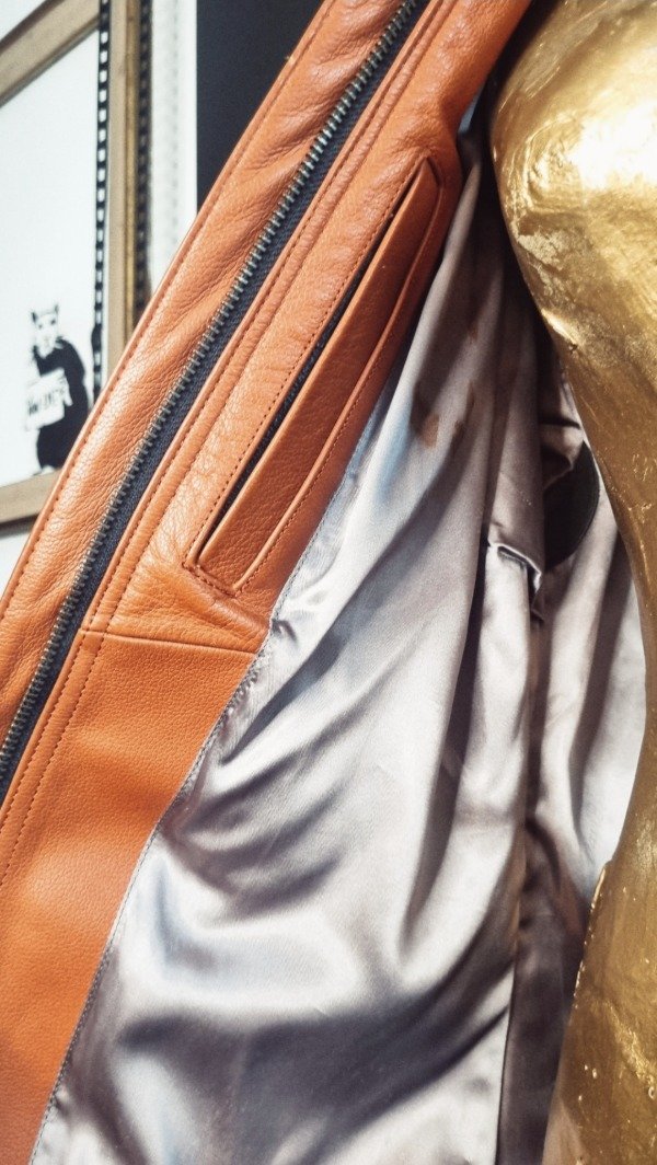 Tiene 2 bolsillos externos y uno interior. Cierra con cierre relámpago.